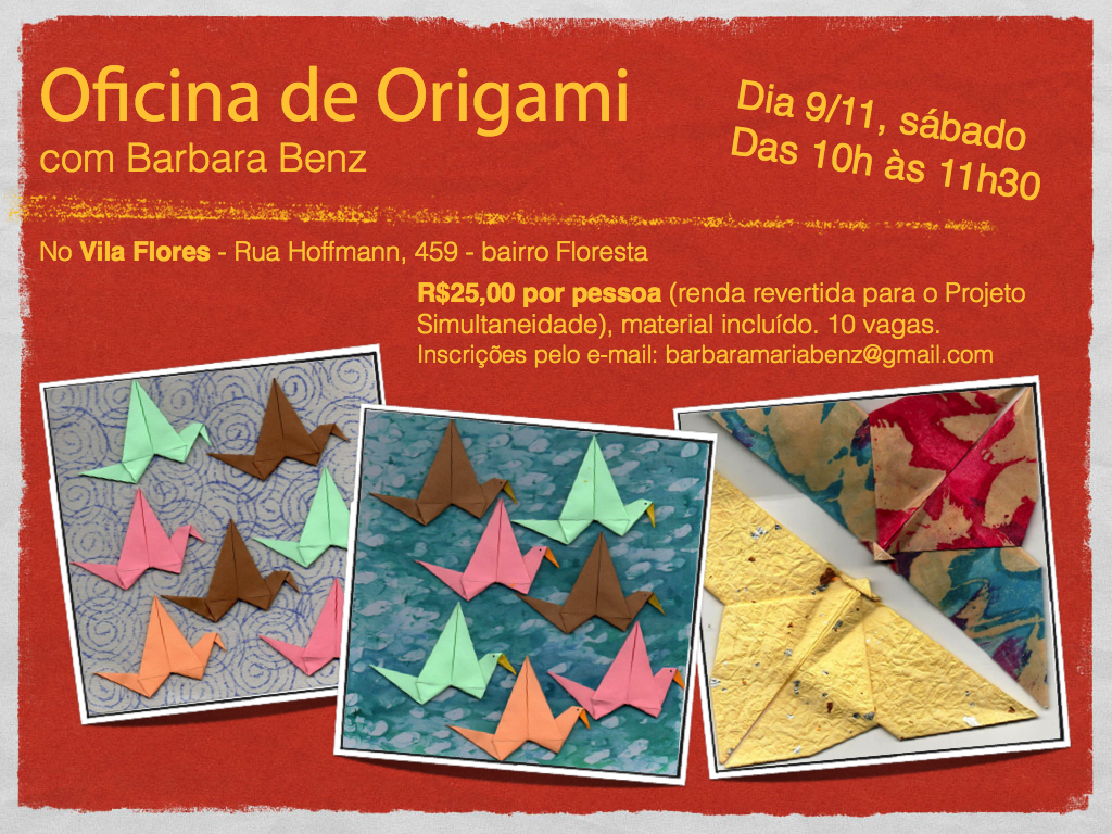 Nossa querida vizinha Barbara Benz vai dar uma oficina de origami na próxima manhã de sábado no Vila Flores! E o valor arrecadado também vai pro Projeto Simultaneidade. Muito bom poder contar com essas parcerias! Inscrições pelo e-mail dela: barbaramariabenz@gmail.com