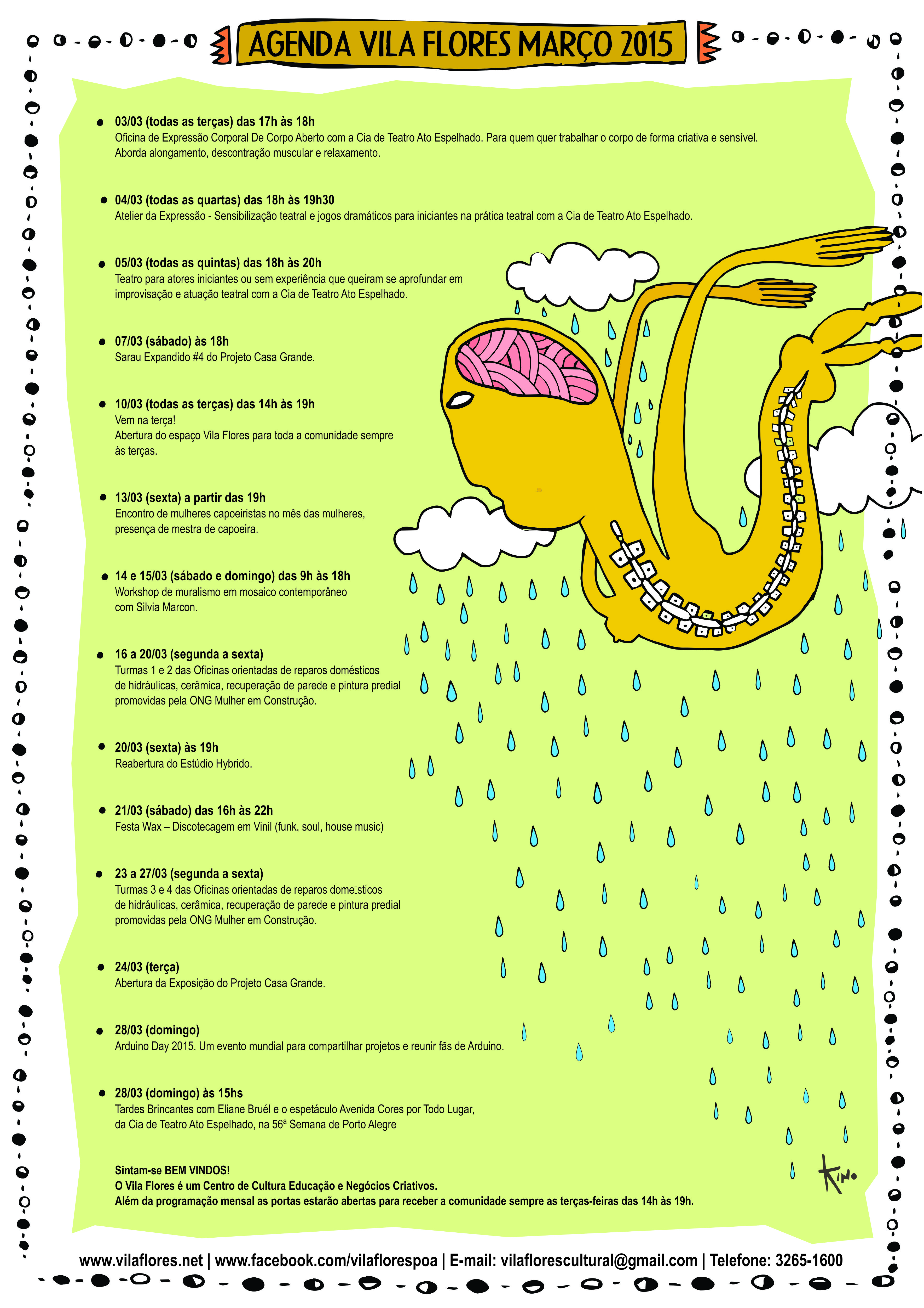 24/03 (terça) das 14h às 19h Vem na terça! Abertura do espaço Vila Flores para toda a comunidade sempre às terças. Local: Miolo do Vila Flores. Entrada pela R. São Carlos, 765.