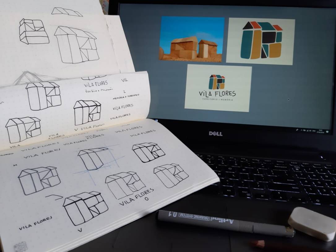 Para criar a nova identidade visual, o Diego se inspirou na animação que abre o webdocumentário, composta por vários blocos de madeira que são parte de um brinquedo pedagógico criado pela companhia teatral Caixa do Elefante. Na animação, de autoria da Maíra e do Anthonio Coelho, os blocos se juntam formando o Vila Flores. o desenho representa não só a estrutura dos nossos edifícios, mas também o entrelaçamento de ideias e pessoas que fazem o Vila ser o que é: um espaço plural, dinâmico e coletivo. A tipografia utilizada também foi criada a mão pelo Diego.