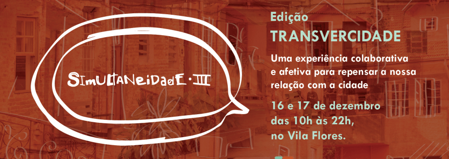 VILA FLORES APRESENTA: 3ª EDIÇÃO DO PROJETO SIMULTANEIDADE "TransVerCidade": a cidade que queremos! Dias 16 e 17 de dezembro acontece a 3ª edição do Projeto Simultaneidade, evento organizado coletivamente pelo espaço Vila Flores e seus parceiros. A temática do ano "TransVerCidade" vem da vontade de mostrar que a cidade que sonhamos e queremos já está… Continuar lendo Projeto Simultaneidade 3ª Edição – TransVerCidade
