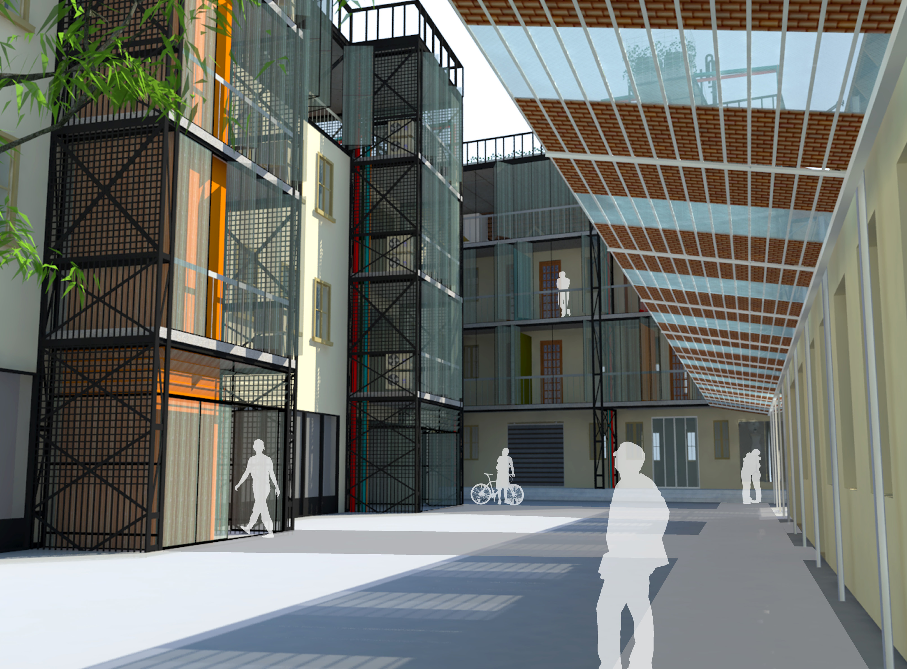 A modificação ocorre na face interna, onde uma nova estrutura organiza as plantas dos pavimentos e suporta as infraestruturas ao novo uso do complexo. Veja na imagem abaixo: