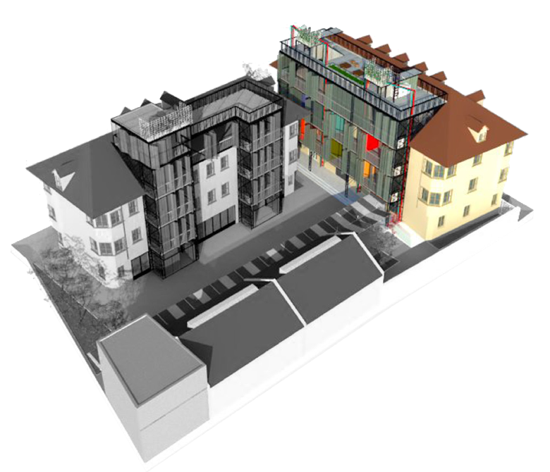 Nas fachadas internas dos dois edifícios, no alinhamento dos núcleos hidráulicos, pensamos uma nova estrutura metálica que parasita os prédios. Essa estrutura