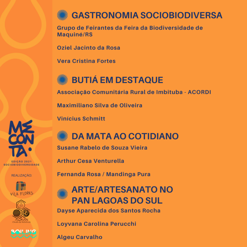 O ME CONTA: Sociobiodiversidade 2021 é um projeto da Associação Cultural Vila Flores e do AsSsAN Círculo, da UFRGS, em parceria com o coletivo holandês WeTheCity, viabilizado com recursos do Projeto PANexus: Governança da sociobiodiversidade para a segurança hídrica, energética e alimentar na Mata Atlântica Sul, através da Chamada Nexus do CNPq e Ministério de Ciência, Tecnologia e Inovações.