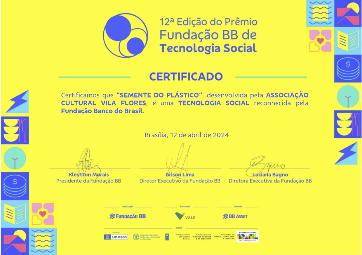Em 2024, o Semente do Plástico foi certificado como Tecnologia Social pela Fundação Banco do Brasil.